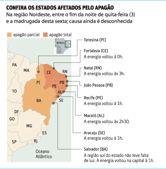 O apagão, ocorrido entre a noite de quinta (3) e a madrugada desta sexta-feira, afetou voos no Rio Grande do Norte, prejudicou o trânsito no Ceará e compromete o abastecimento de água em pelo menos seis Estados: Ceará, Rio Grande do Norte, Bahia, Paraíba, Alagoas e Pernambuco.